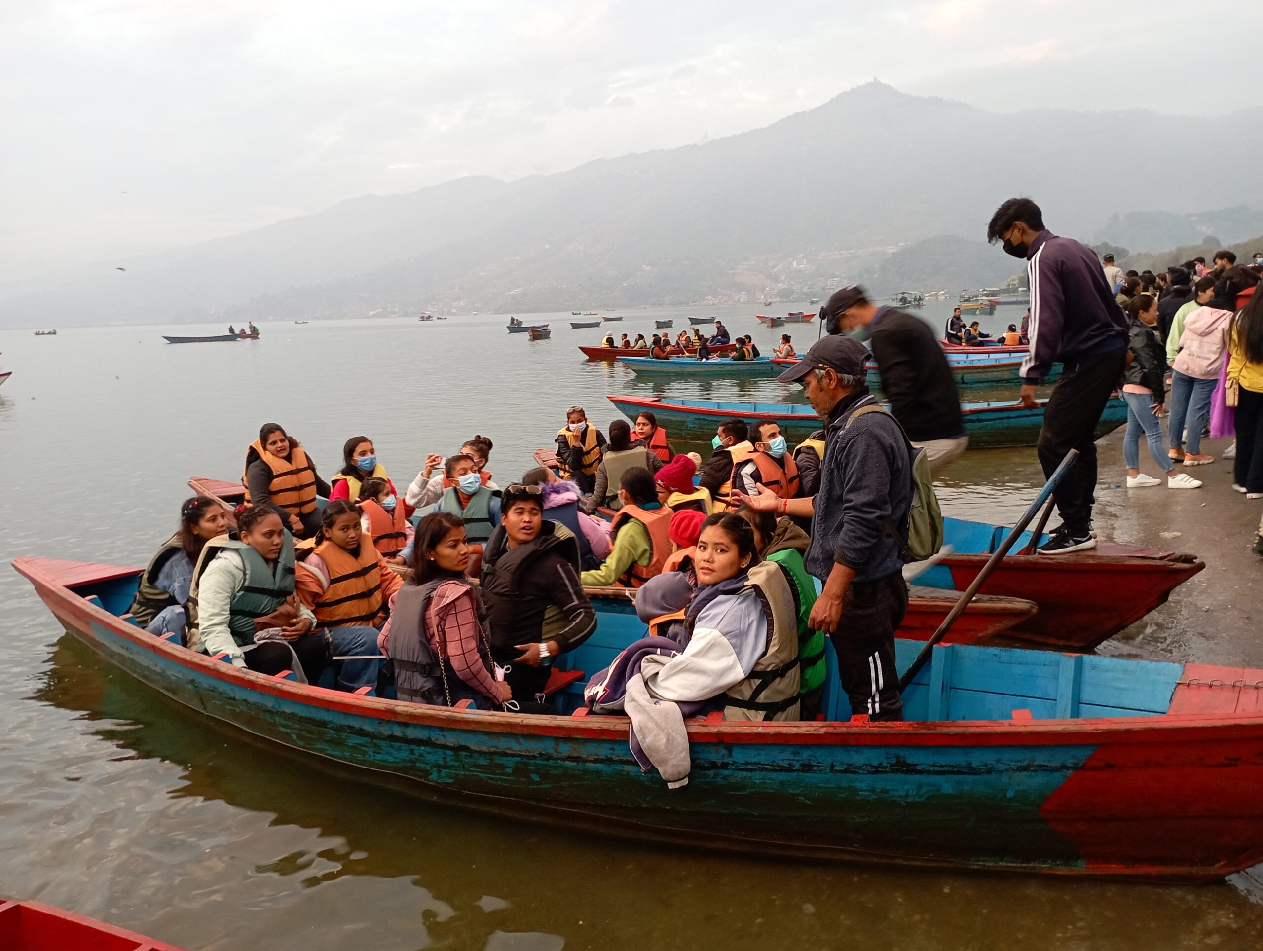 आन्तरिक तथा वाह्य पर्यटकले भरिभराउ फेवातालमा कोही डुङ्गा चढ्न आतुर थिए । कोही फोटो तथा सेल्फी खिच्दै डुङ्गा सयर गर्दै थिए । भिड धेरै भएका कारण हामी केही समय तालको किनारमा फोटो खिच्दै रमाइलो गर्दै बितायौं । केही समयको प्रतिक्षा पछि डुङ्गामा सयर गर्ने मेरो बेग्र प्रतिक्षा पुरा भयो ।