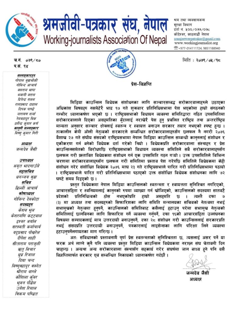 ‘मिडिया काउन्सिल विधेयक संशोधनका लागि सञ्चारसम्बद्ध सरोकारवालाहरुले उठाएका अधिकांश विषयहरु नसमेटेरै भाद्र १७ गते शुक्रवार प्रतिनिधिसभामा पेश भएकोमा हाम्रो संगठनको गम्भीर ध्यानाकर्षण भएको छ ।’ विज्ञप्तीमा भनिएको छ, ‘राष्ट्रियसभाको विधायन व्यवस्था समितिद्धारा गठित उपसमितिमा सरोकारवालाले दिएका असहमतिका बुँदालाई नराखेरै पेश हुनु प्रचलित राष्ट्रिय तथा अन्तर्राष्ट्रिय मान्यता अनुसार सञ्चार क्षेत्रलाई स्वतन्त्र र स्वायत्त बनाउन सरकार तयार नभएको स्पष्ट हुन्छ ।’