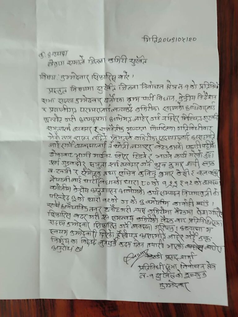 उनले विज्ञप्तीमा निर्वाचन क्षेत्र नम्बर एकको प्रतिनिधि सभा उम्मेदवार छनौटमा निश्चित गुटबन्दी गरिएको, शत्रुतापूर्ण व्यवहार गरिएको र राजनैतिक गतिविधिबाट आफ्नो नाम राख्न नदिने रणनीति अवलम्बन गरिएको आरोप लगाएका हुन ।