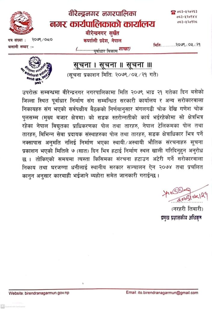 वीरेन्द्रनगर नगरपालिकाले मंगलगढी चौकदेखी गणेश चौकसम्मका संरचना हटाउन सात दिने सूचना जारी गरेको हो ।