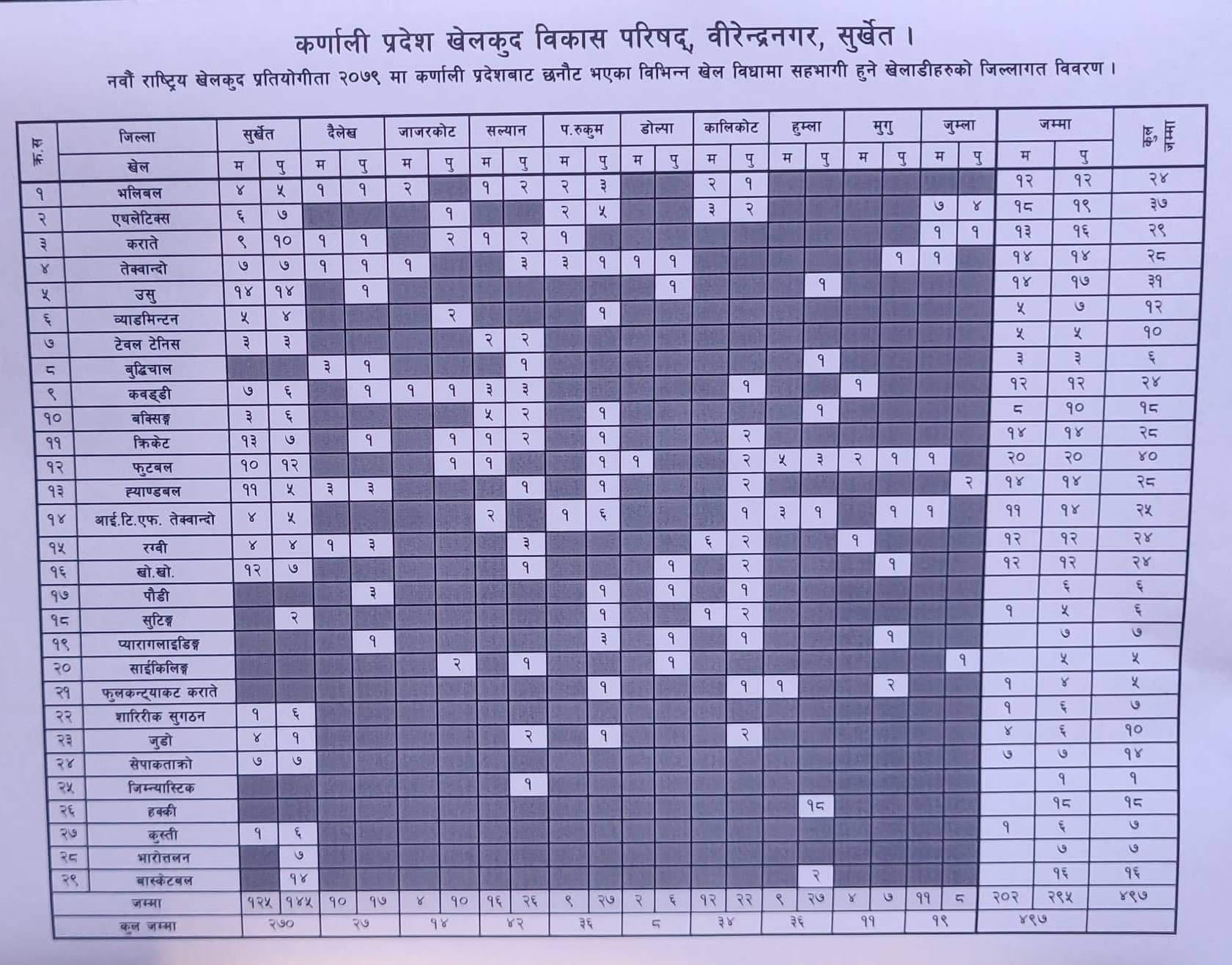 तेक्वान्दो पुरुष १ कवड्डी महिला १ फुटबल महिला २ पुरुष १ आई.टि.एफ.तेक्वान्दो पुरुष १ रग्वी महिला १ खो.खो. पुरुष १ प्यारागलाइपडङ्ग पुरुष १ फुलकन्ट्याकट कराँते पुरुष २ गरि ११ जना र जुम्लाबाट एथ्लेटिक्स महिला ७ पुरुष ४ कराँते महिला १ पुरुष १ तेक्वान्दो महिला १ फुटबल महिला १ ह्याण्डबल पुरुष २ आई.टि.एफ.तेक्वान्दो महिला १ साइकिलिङ्ग पुरुष १ गरि कुल १९ जनाले खेलमा सहभागिता जनाउने भएको सदस्य सचिव विश्वामित्र संज्यालले बताए ।