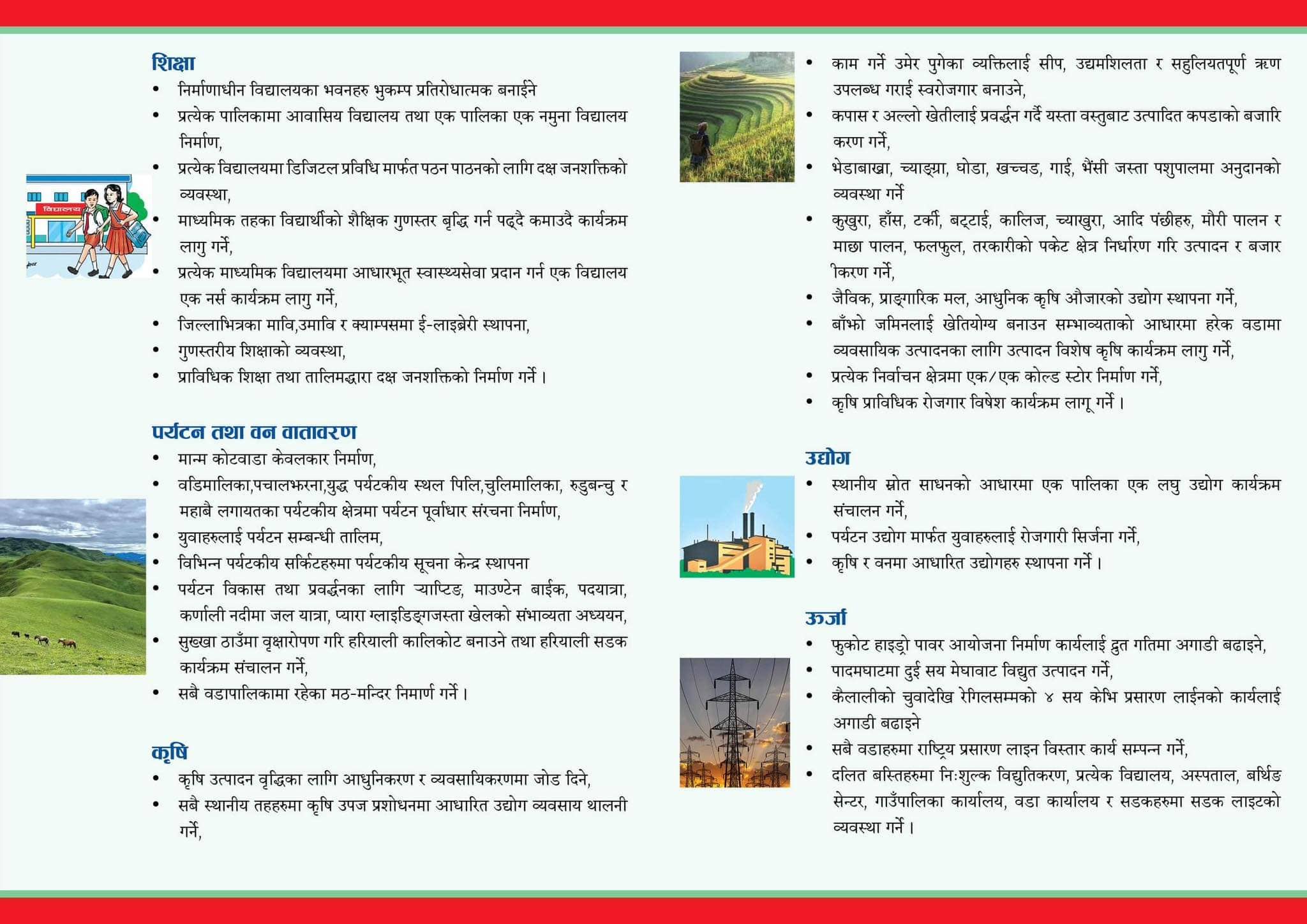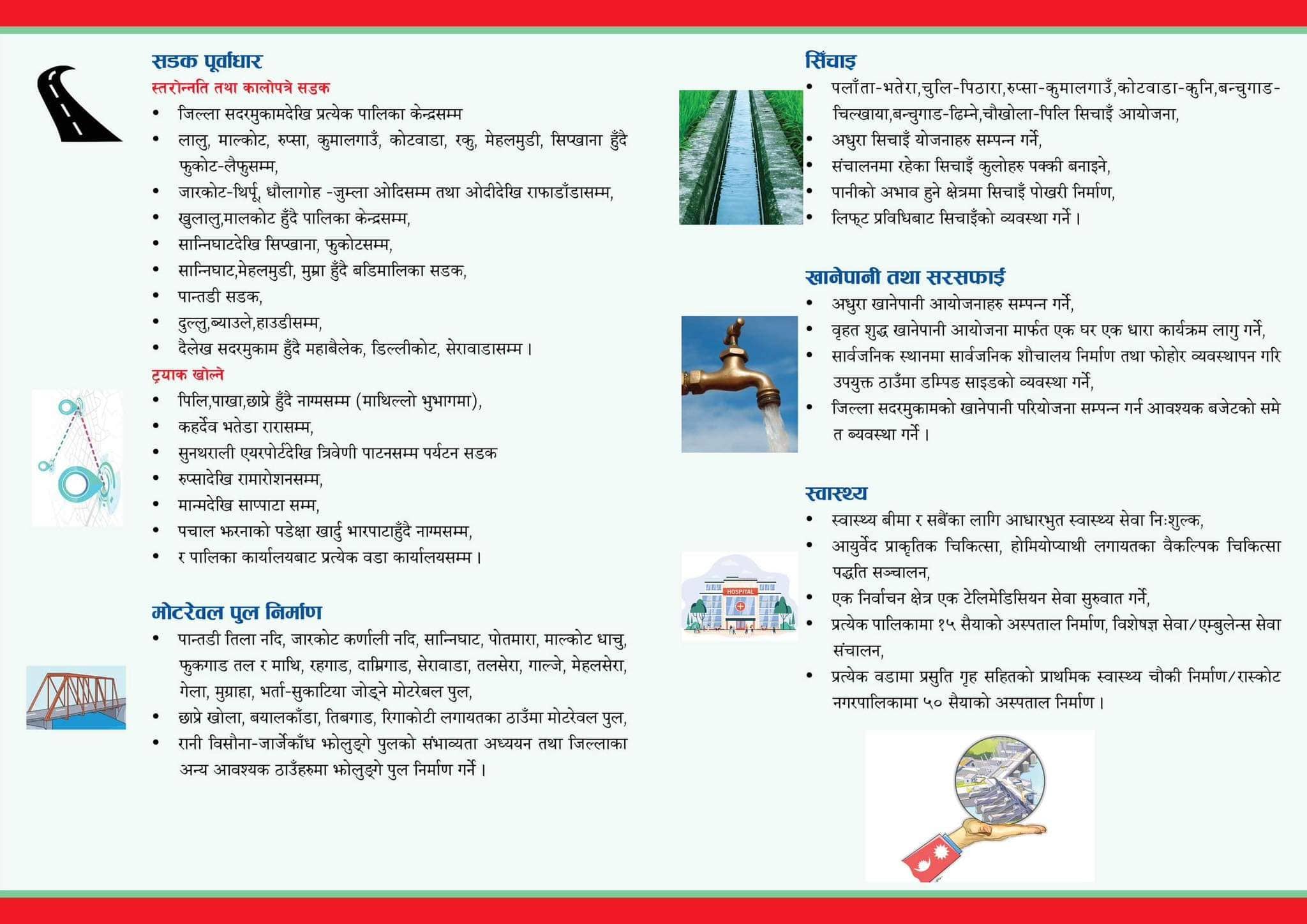 यस्तै सबै बस्तीमा विद्युतीकरण गर्नेदेखि ठाउँ–ठाउँमा मोटरेबल पुल निर्माण गरिने उनले उल्लेख गरेका छन् । साथै उनले प्रत्येक पालिकामा १५ शैयाको अस्पताल बनाउन पहल गरिने समेत बताएका छन् । यस्तै विकट क्षेत्रमा फाइवर इन्टरनेट पुर्याउने, आर्थिक आत्मनिर्भरताको बाटोमा अघि बढाउन पहल गर्ने र मान्म–कोटवाडा केबलकार निर्माण गरिने शाहीको प्रतिबद्धतामा उल्लेख छ ।
