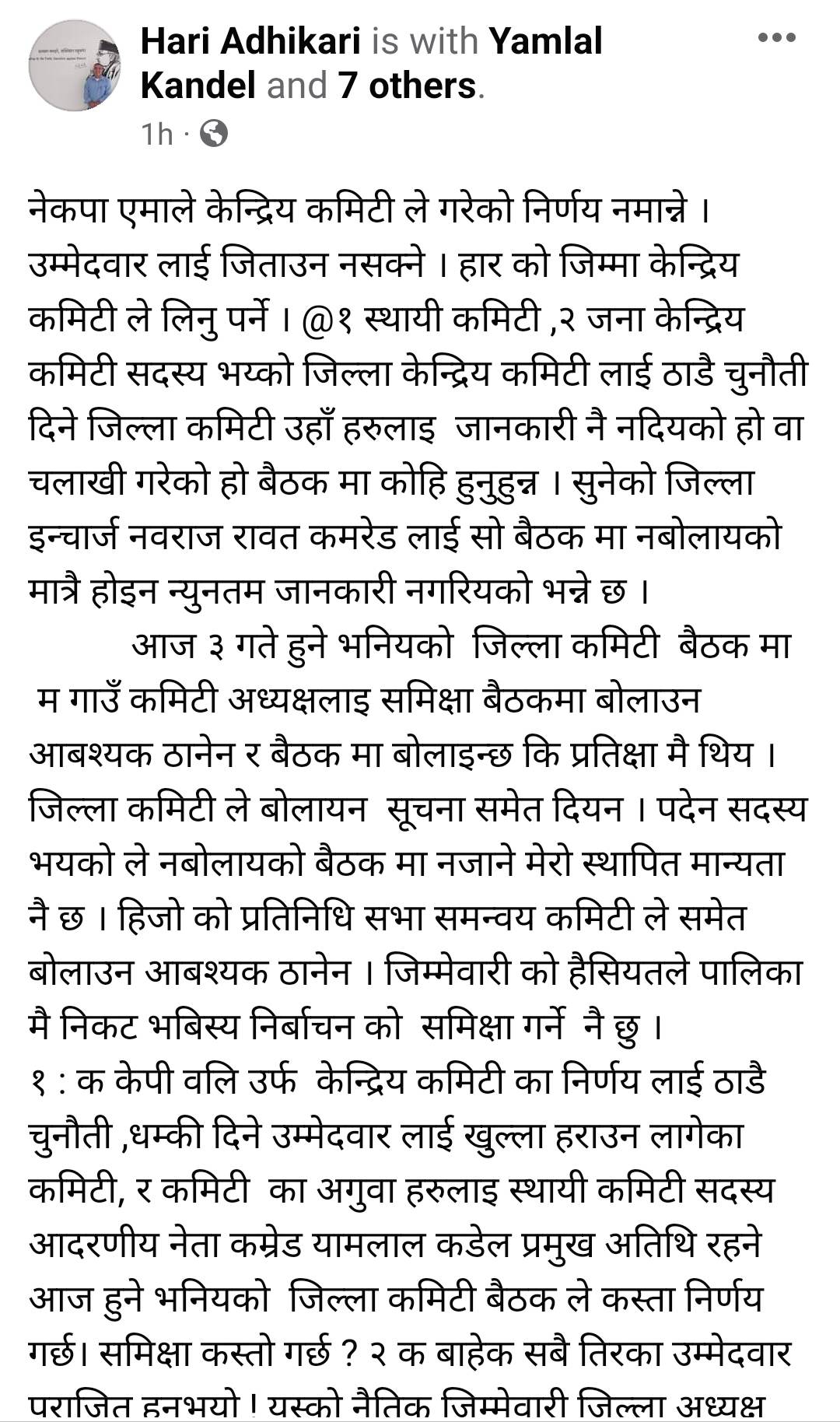 आज सामाजिक सञ्जाल फेसबुकमा एमाले चौकुने पालिका कमिटि अध्यक्ष्ँ हरि अधिकारीले लामो स्टाटस लेख्दै वैठकमा आफूलाई नबोलाइएको प्रति ध्यानाकर्षण भएको बताउँदै कर्मकाण्डि समिक्षा वैठकमा आफू उपस्थित नहुने उल्लेख गरेका छन् ।