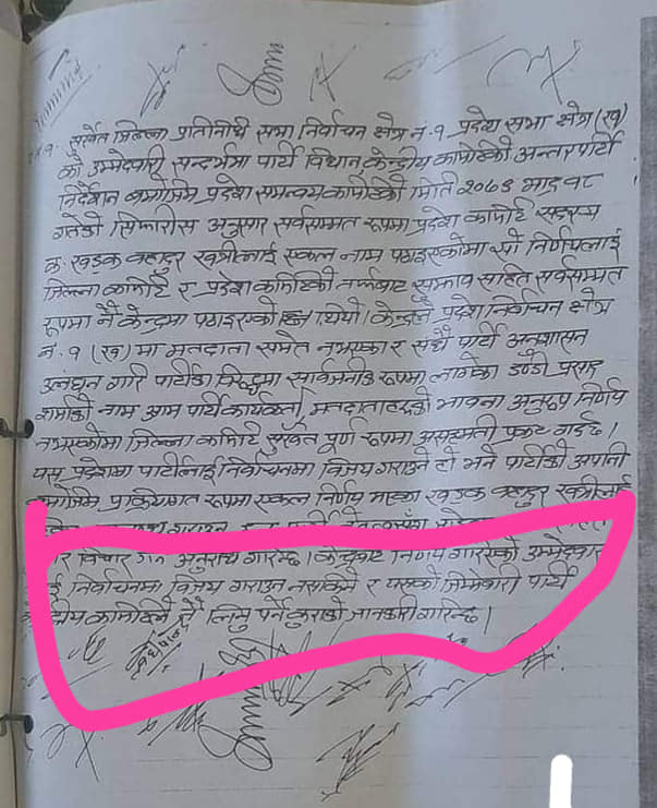 नेकपा एमाले केन्द्रिय कमिटीले गरेको निर्णय नमान्ने । उम्मेदवारलाई जिताउन नसक्ने । हारको जिम्मा केन्द्रीय कमिटीले लिनुपर्ने । १ स्थायी कमिटी,२ जना केन्द्रीय कमिटी सदस्य भएको जिल्ला केन्द्रिय कमिटीलाई ठाडै चुनौती दिने जिल्ला कमिटी, उहाँहरुलाइ जानकारी नै नदिएको हो वा चलाखी गरेको हो बैठकमा कोहि हुनुहुन्न । सुनेको जिल्ला इन्चार्ज नवराज रावत कमरेडलाई सो बैठकमा नबोलाइएको मात्रै होइन न्युनतम जानकारी नगरिएको भन्ने छ ।