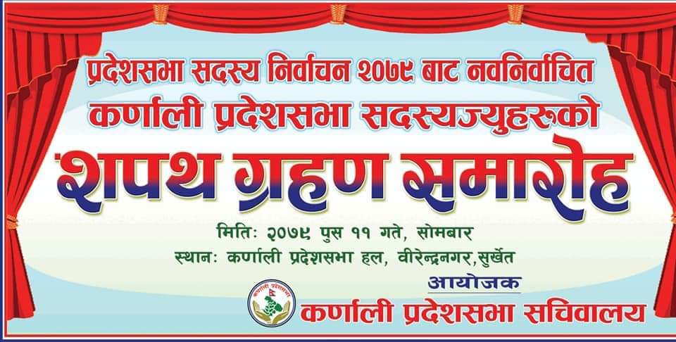 कर्णाली प्रदेश सभामा विजयी बनेर आएका सांसदहरुले आज सपथग्रहण गर्ने भएका छन् । यसकालागि प्रदेश सभा सचिवालयले सबै तयारी पुरा गरिसकेको जनाएको छ ।