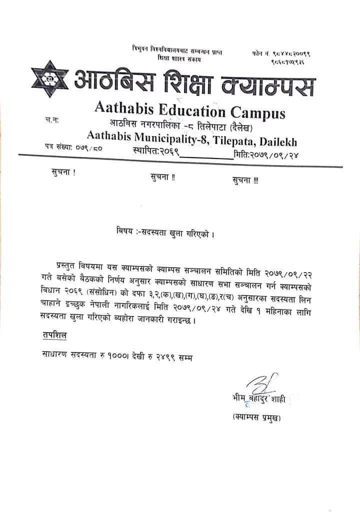 दैलेखको आठबीस शिक्षा क्याम्पसले इच्छुक नेपाली नागरिकलाई सधारण सदस्य बन्न आव्हान गरेको छ । क्याम्पस प्रशासनले एक सूचना जारी गर्दै पुस २२ गते बसेको क्याम्पस सञ्चालन समितिको वैठकले साधारण सभा सञ्चालन गर्न उक्त आव्हान गर्ने निर्णय गरेको हो ।