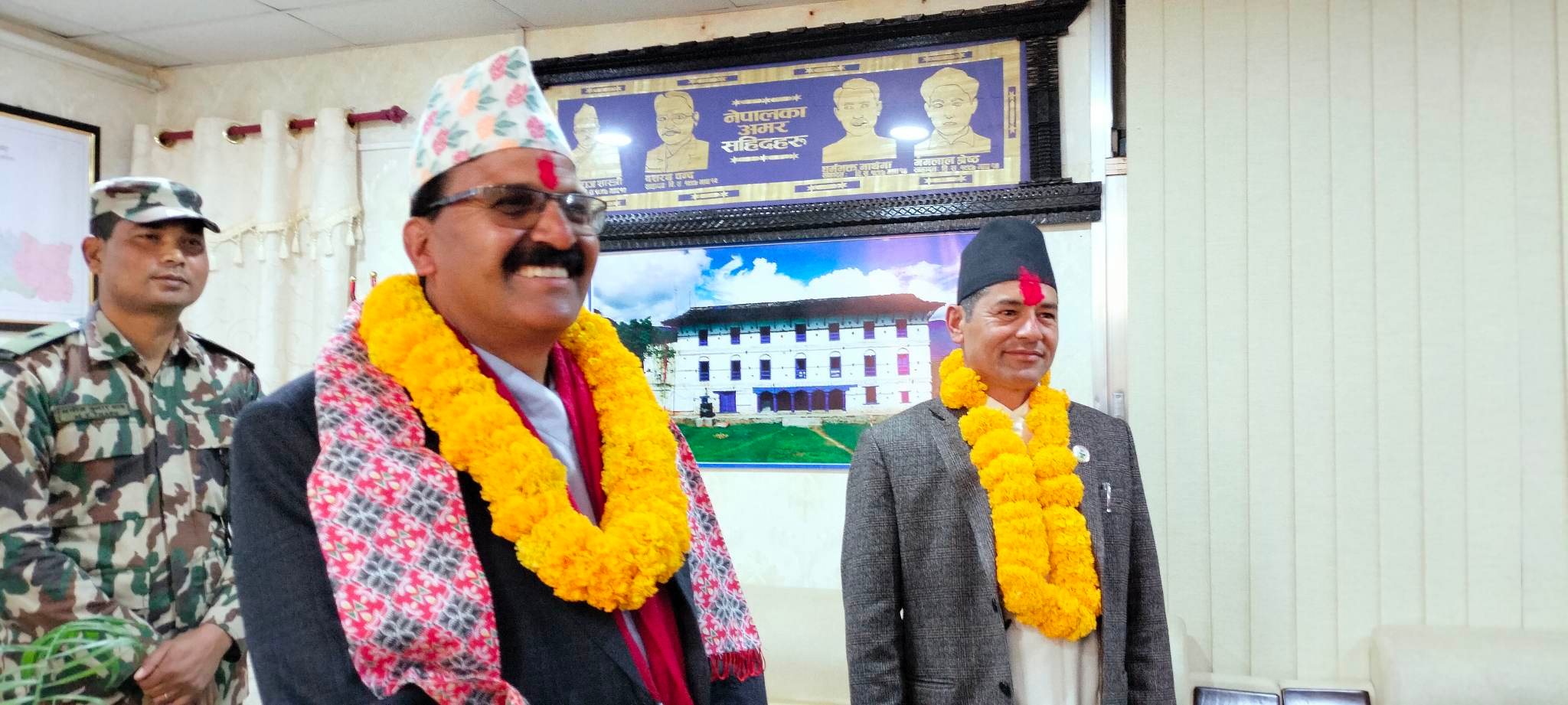 कार्यालयका प्रमुख सचिवलगायतका कर्मचारीहरुले उनलाई भव्यताका साथ स्वागत गरे । फुलमाला लगाए ।