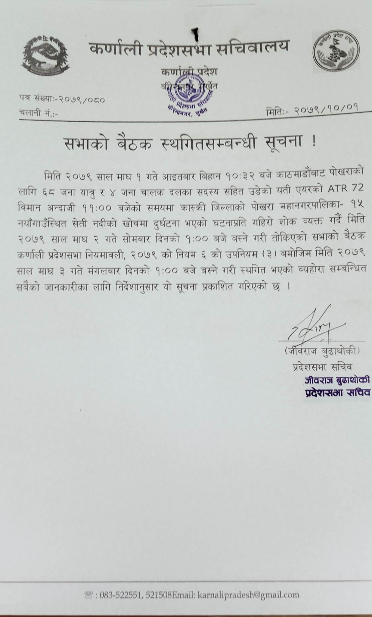 ‘मिति २०७९ साल माघ १ गते आइतबार बिहान १०ः३२ बजे काठमाडौंबाट पोखराको लागि ६८ जना यात्रु र ४ जना चालक दलका सदस्य सहित उडेको यती एयरको एटिआर ७२ विमान अन्दाजी ११ः०० बजेको समयमा कास्की जिल्लाको पोखरा महानगरपालिका– १५ नयाँगाउँस्थित सेती नदीको खोचमा दुर्घटना भएको घटनाप्रति गहिरो शोक व्यक्त गर्दै मिति २०७९ साल माघ २ गते सोमबार दिनको १ः०० बजे बस्ने गरी तोकिएको सभाको बैठक कर्णाली प्रदेशसभा नियमावली, २०७९ को नियम ६ को उपनियम (३) बमोजिम मिति २०७९ साल माघ ३ गते मंगलवार दिनको १ः०० बजे बस्ने गरी स्थगित भएको व्यहोरा सम्बन्धित सबैको जानकारीका लागि निर्देशानुसार यो सूचना प्रकाशित गरिएको छ ।’