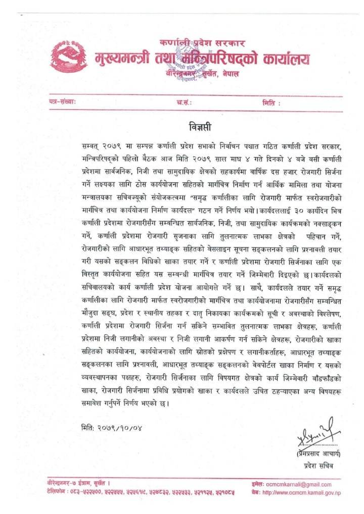 कर्णाली प्रदेश सरकारको पहिलो वैठकले कर्णालीका दश हजार बेरोजगार युवालाई प्रतिवर्ष रोजगार दिने योजना निर्माण गर्न कार्यदल गठन गरेको छ ।