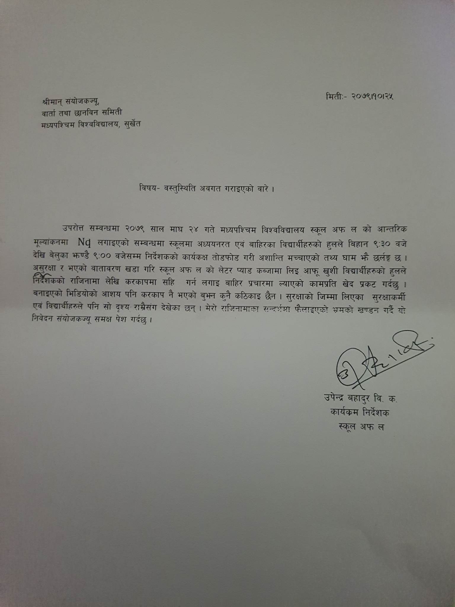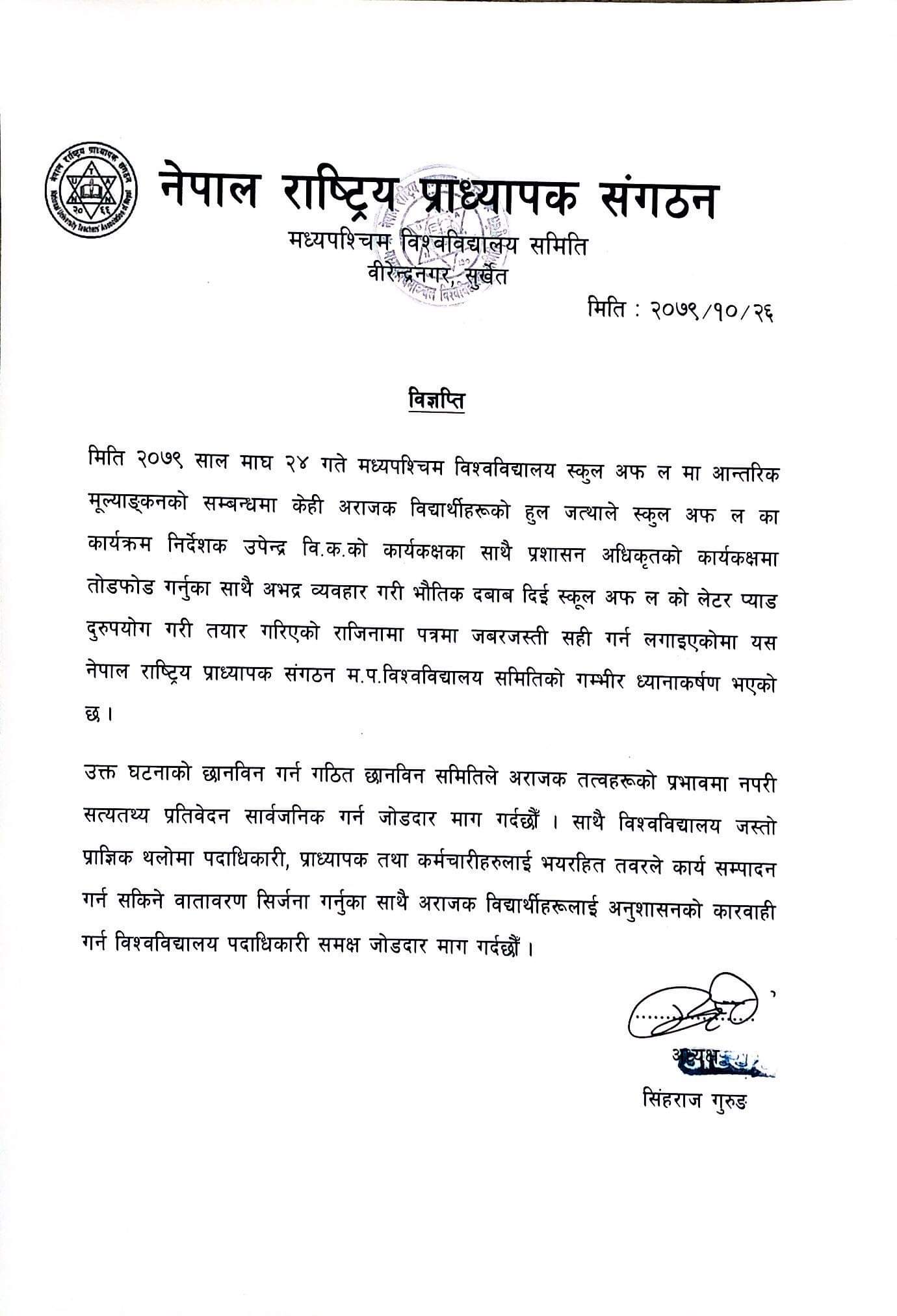 ‘मिति २०७९ साल माघ २४ गते मध्यपश्चिम विश्वविद्यालय स्कुल अफ ल मा आन्तरिक मूल्याङ्कनको सम्बन्धमा केही अराजक विद्यार्थीहरूको हुल जत्थाले स्कुल अफ ल का कार्यक्रम निर्देशक उपेन्द्र विकको कार्यकक्षका साथै प्रशासन अधिकृतको कार्यकक्षमा तोडफोड गर्नुका साथै अभद्र व्यवहार गरी भौतिक दबाब दिई स्कूल अफ ल को लेटर प्याड दुरुपयोग गरी तयार गरिएको राजिनामा पत्रमा जबरजस्ती सही गर्न लगाइएकोमा यस नेपाल राष्ट्रिय प्राध्यापक संगठन म.प. विश्वविद्यालय समितिको गम्भीर ध्यानाकर्षण भएको छ ।’