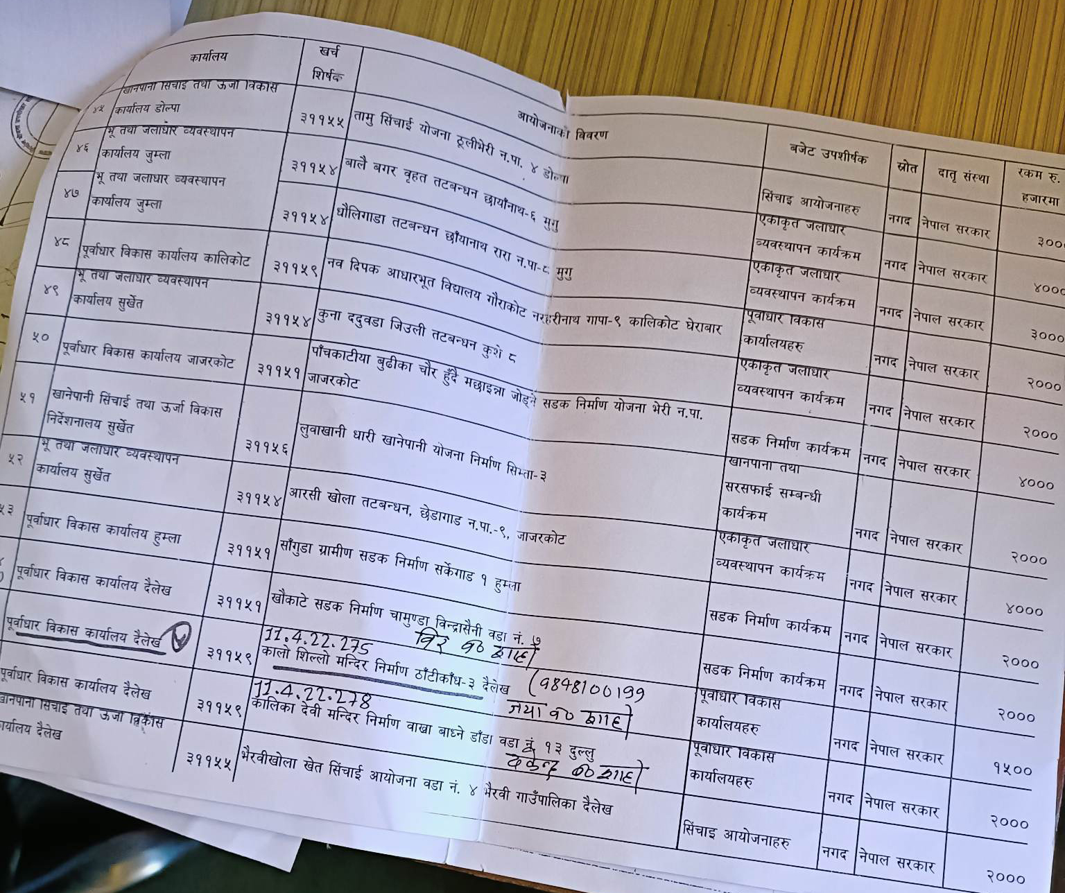 कर्णाली प्रदेश सरकारका आर्थिक मामिला तथा योजना मन्त्री विनोद कुमार शाहले सरकार ढल्ने सम्भावना भएकै समय पारेर आफ्नो निर्वाचन क्षेत्र सहित कर्णालीका दश जिल्लामा रातो किताबमा प्रकाशित योजना बाहेक नयाँ ६७ ओटा योजनामा बजेट विनियोजन गरेका थिए । केन्द्रमा एमाले माओवादी सहितको सरकार ढल्ने निश्चित भएसँगै मन्त्री शाहले फागुन १६ गते ती आयोजनामा २३ करोड २० लाख रुपैंया पठाएका हुन ।
