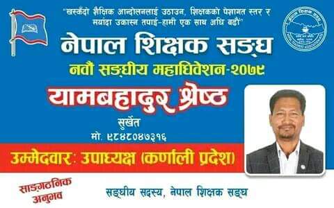 नेपाली काँग्रेस निकटको नेपाल शिक्षक संघको आसन्न नवौं महाधिवेशनकालागि कर्णालीको भूगोलतर्फबाट उपाध्यक्षमा जन नमूना माध्यमिक विद्यालय वीरेन्द्रनगर सुर्खेतका प्रधानाध्यापक याम श्रेष्ठले उम्मेदवारी दिने भएका छन् ।