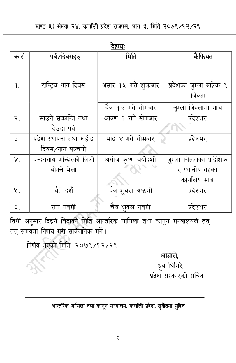 कर्णाली प्रदेश सरकारले कर्णालीका दश ओटै जिल्लामा लागु हुने गरि विभिन्न मितिमा ६ ओटा विदा दिने निर्णय गरेको छ । आन्तरिक मामिला तथा कानून मन्त्रालयले आज प्रदेश राजपत्रमा एक सूचना जारी गर्दै सो जानकारी दिएको हो ।