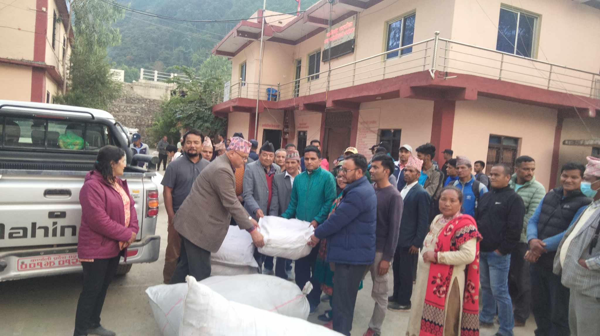 “कर्णाली प्रदेशका अति प्रभावित यी दुई पालिकामा पीडितहरुले न्यानो कपडा नपाएको गुनासो आएको थियो”, सचिव डा. देवकोटाले भने, “त्यहाँका केहि नागरिकलाई राहत दिने भनेर करिब तीन लाख बराबरका त्रिपाल र व्ल्यांकेट वितरण गरेका हौं ।”