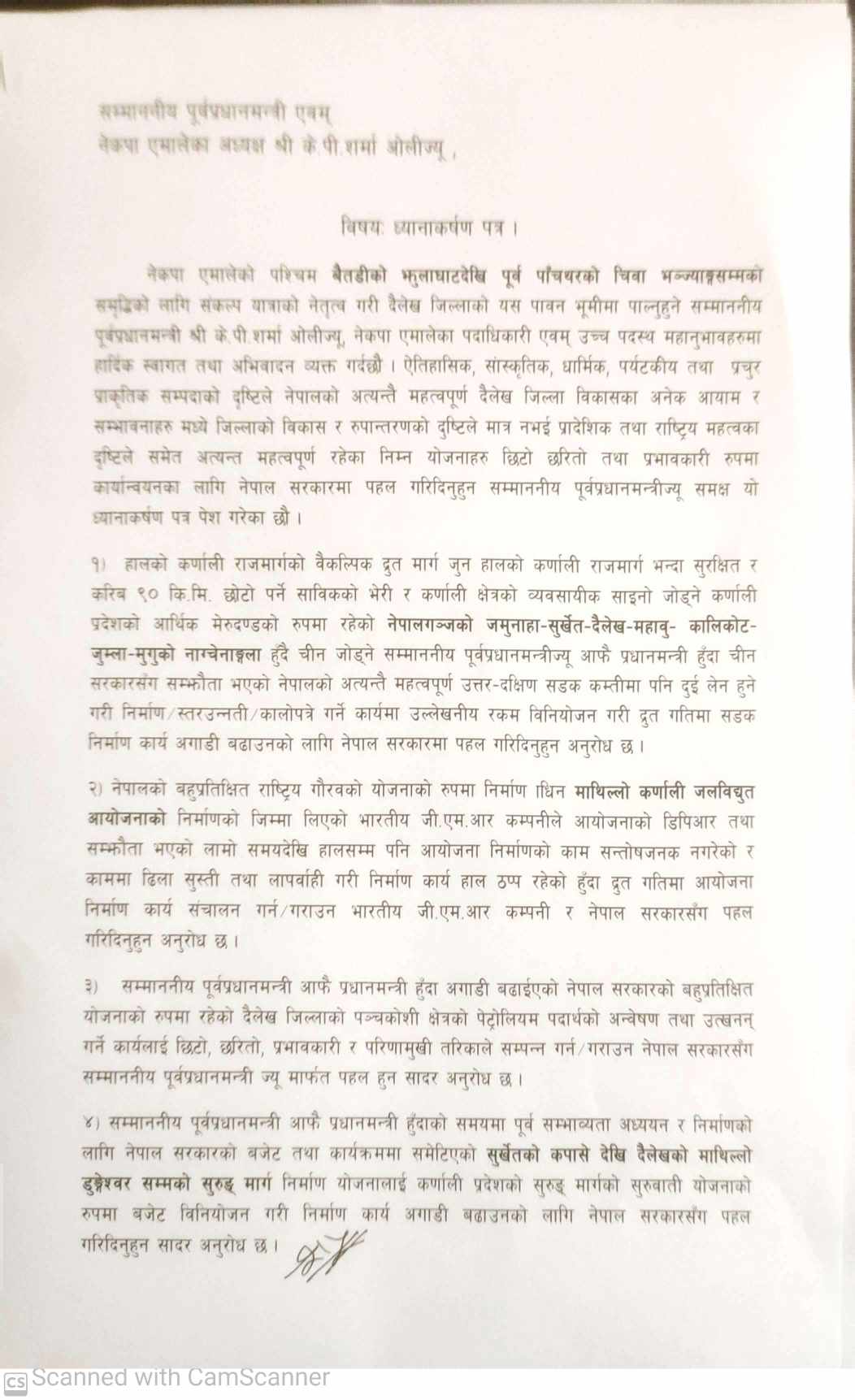 १) हालको कणर्णाली राजमार्गको वैकल्पिक द्रुत मार्ग जुन हालको कर्णाली राजमार्ग भन्दा सुरक्षित र करिब ९० कि.मि. छोटो पर्ने साविकको भेरी र कर्णाली क्षेत्रको व्यवसायीक साइनो जोड्ने कर्णाली प्रदेशको आर्थिक मेरुदण्डको रुपमा रहेको नेपालगञ्जको जमुनाहा–सुर्खेत–दैलेख–महाबु– कालिकोट– जुम्ला–मुगुको नाम्चेनाङ्गला हुदै चीन जोड्ने सम्माननीय पूर्वप्रधानमन्त्रीज्यू आफै प्रधानमन्त्री हुँदा चीन सरकारसँग सम्झौता भएको नेपालको अत्यन्तै महत्वपूर्ण उत्तर–दक्षिण सडक कम्तीमा पनि दुई लेन हुने गरी निर्माण स्तरउन्नती कालोपत्रे गर्ने कार्यमा उल्लेखनीय रकम विनियोजन गरी द्रुत गतिमा सडक निर्माण कार्य अगाडी बढाउनको लागि नेपाल सरकारमा पहल गरिदिनुहुन अनुरोध छ ।