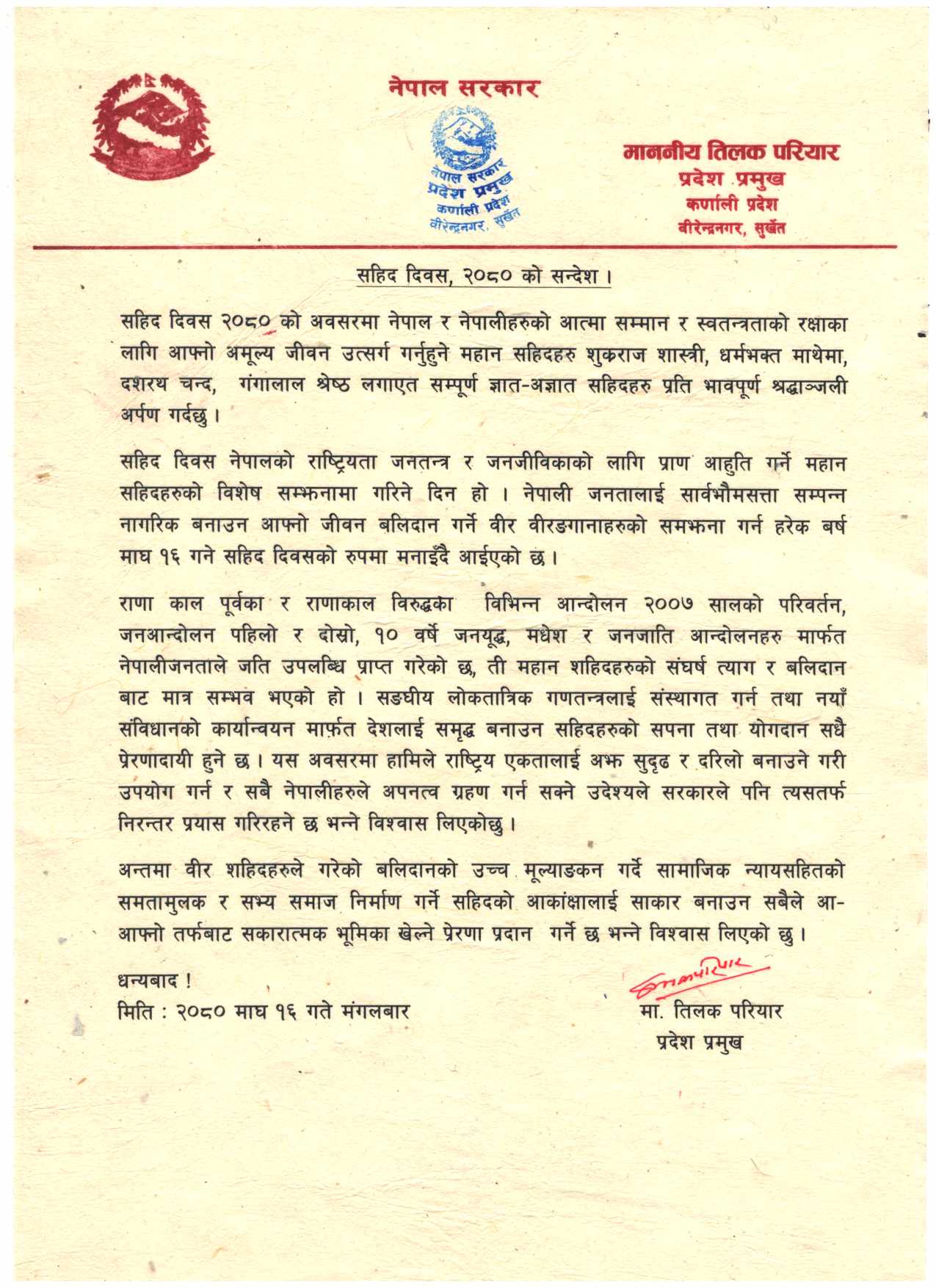 शहिद दिवसको अवसर पारेर आज एक विज्ञप्ती जारी गर्दै प्रदेश प्रमूखले वीर शहिदहरुले गरेको बलिदानको उच्च मूल्याङकन गर्दे सामाजिक न्यायसहितको समतामुलक र सभ्य समाज निर्माण गर्ने सहिदको आकांक्षालाई साकार बनाउन सबैले आ–आफ्नो तर्फबाट सकारात्मक भूमिका खेल्ने प्रेरणा प्रदान गर्ने छ भन्ने विश्वास समेत लिएका छन् ।