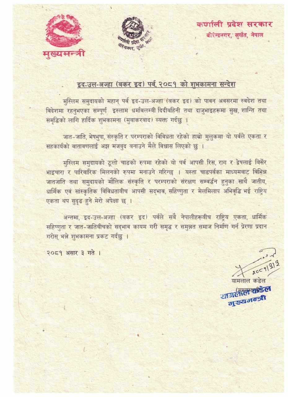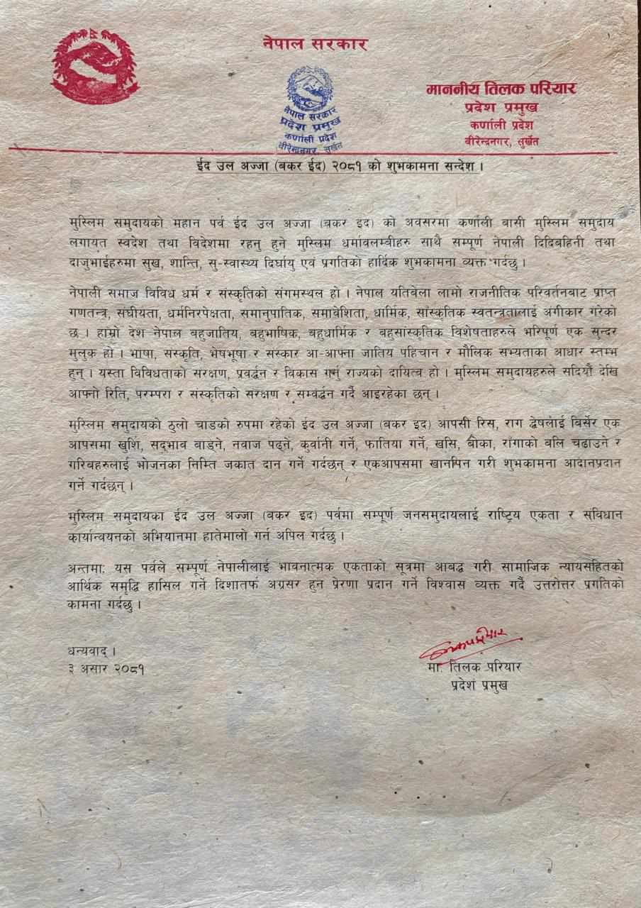 सुर्खेत । मुस्लिम समुदायको महान पर्व ईद उल अज्जा (बकर ईद) २०८१ को अवसरमा कर्णाली प्रदेशका प्रदेश प्रमूख तिलक परियार र मुख्यमन्त्री यामलाल कंडेलले शुभकामना दिएका छन् ।