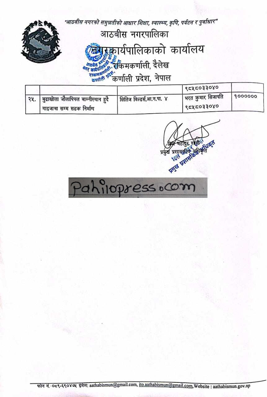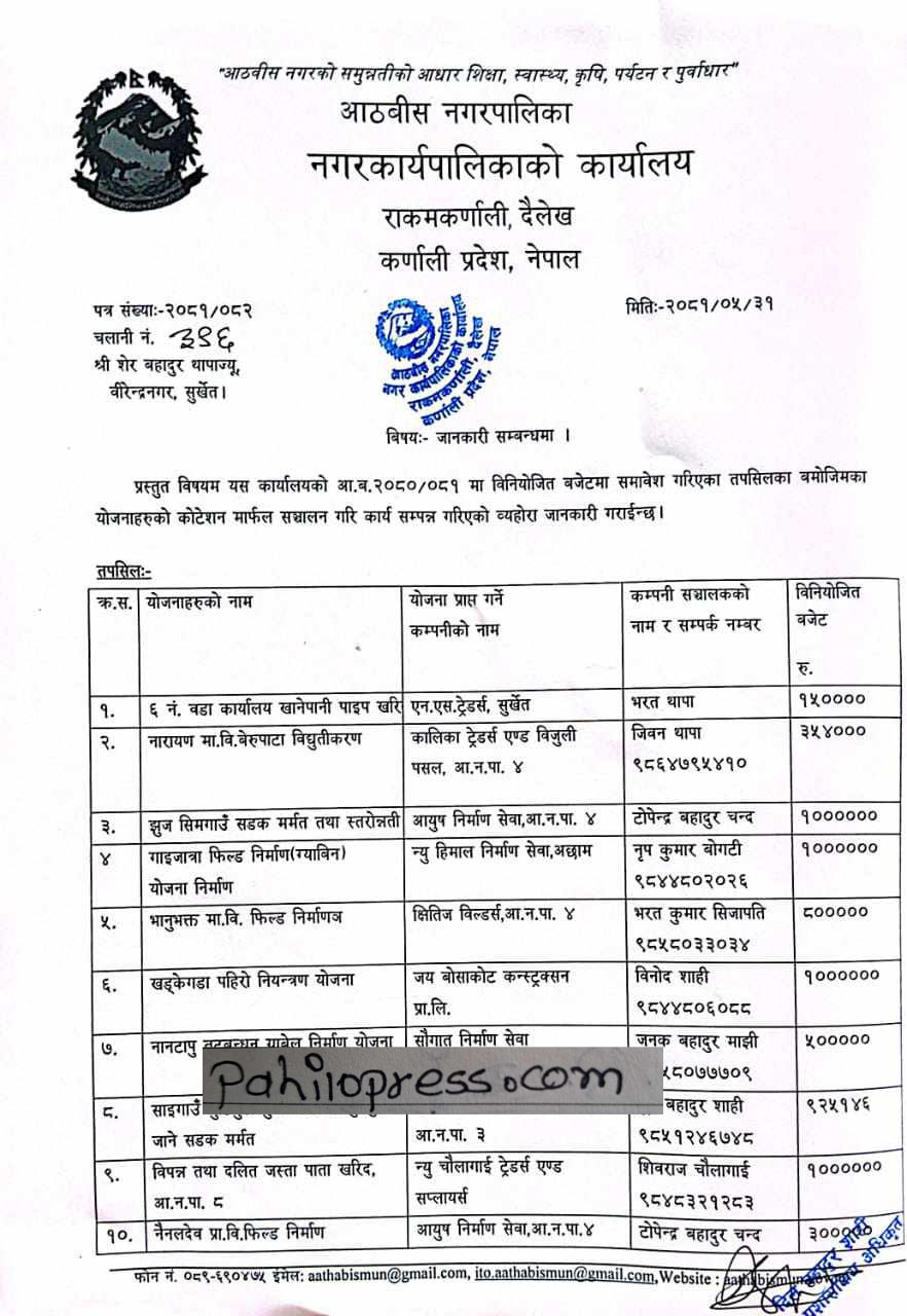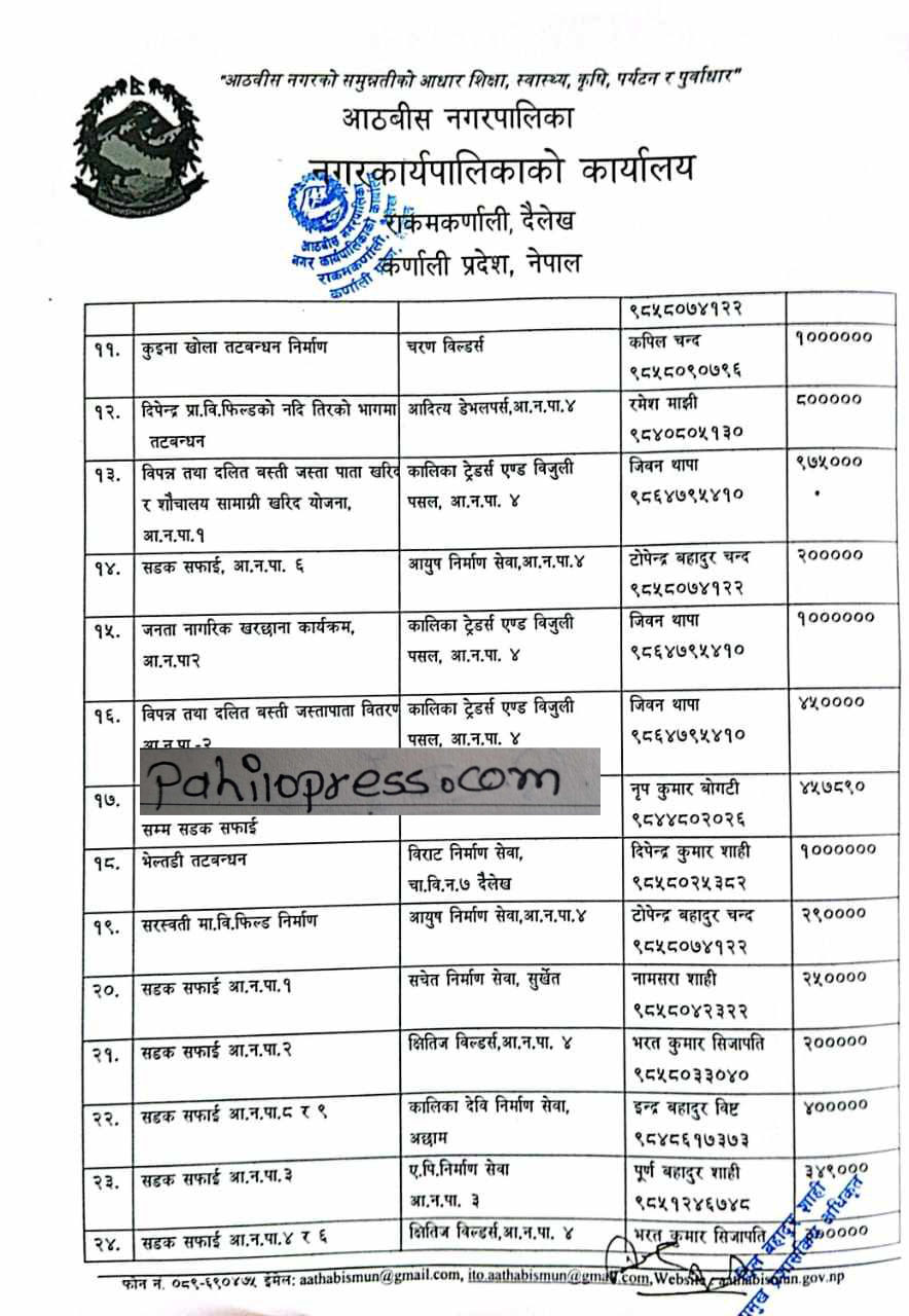 यस्तै, कोटेशनमै भरत कुमार सिजापतिले काम गरेका छन् । उनको क्षितिज विल्डर्सले आठबीस नगरपालिका वडा नम्बर दुई सडक सफाई भनेर दुई लाख, बुढाखोला जौला पिपल वाम्नीस्थान हुँदै गाईजात्रा सम्म सडक निर्माण अन्र्तगत दश लाख, सडक सफाई वडा नम्बर ४ र ६ भनेर तीन लाख र भानुभक्त मिावि फिल्ड निर्माण भनेर आठ लाख रुपैंया नगरपालिकाबाट विनियोजित भएको विवरण नगरपालिकाले उपलब्ध गराएको हो ।