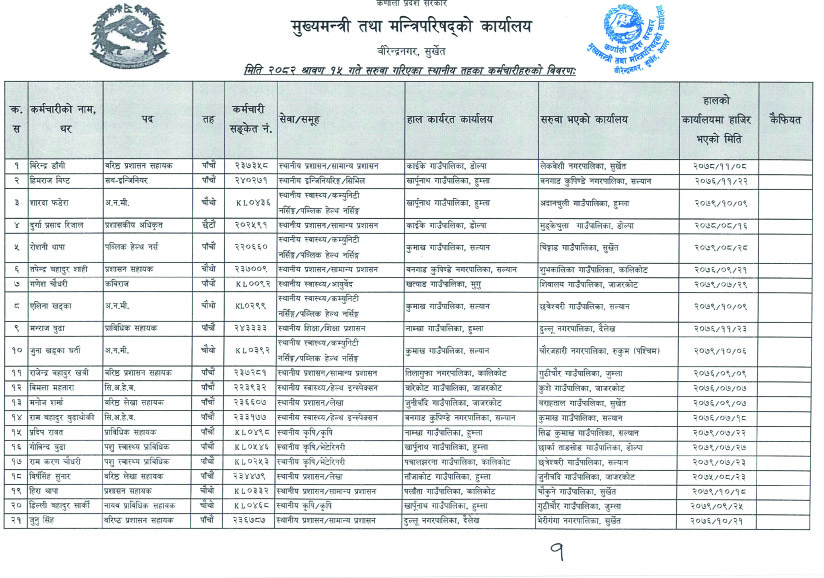 सुर्खेत । कर्णाली प्रदेशको मुख्यमन्त्री तथा मन्त्री परिषदको कार्यालयले कर्णाली प्रदेशका विभिन्न स्थानीय तहमा कार्यरत रहेका कर्मचारीलाई संघीयता आइसकेपछि पहिलोपटक सरुवा गरेको छ ।