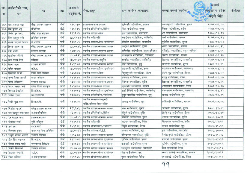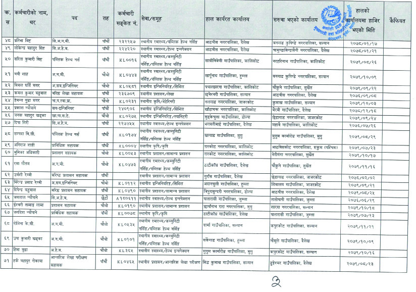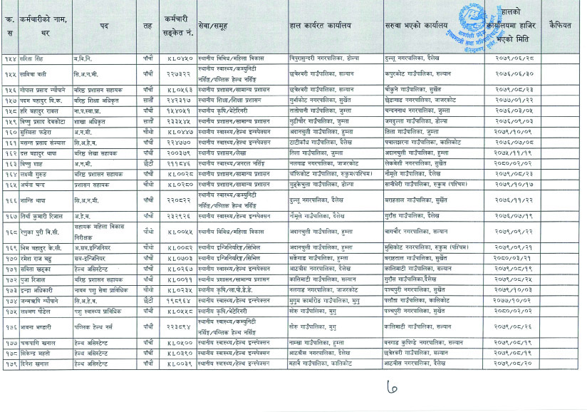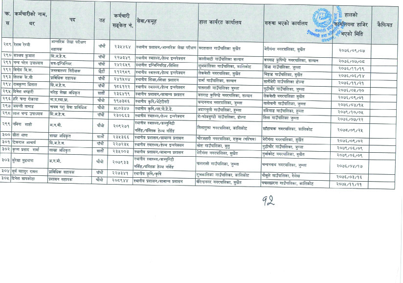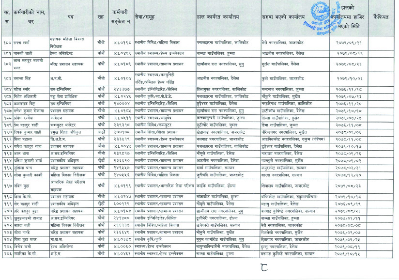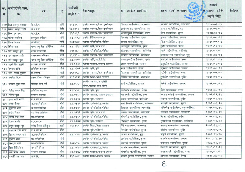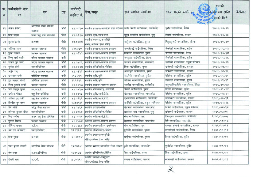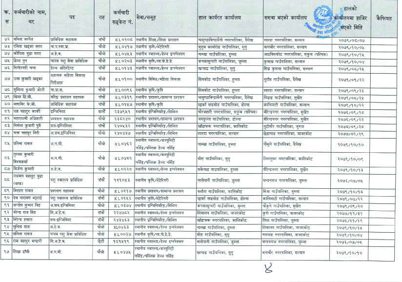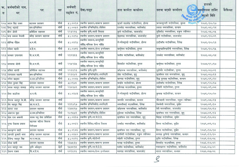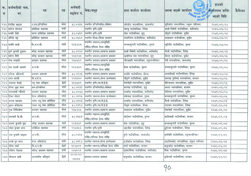 सरुवा सूची हेर्दा दुर्गम जिल्लाहरू डोल्पा, हुम्ला, मुगु, कालीकोट, जाजरकोटदेखि सुगम मानिने सुर्खेत र सल्यानसम्मका स्थानीय तहहरूमा कार्यरत कर्मचारीहरूलाई एकापसमा सरुवा गरिएको देखिन्छ ।
