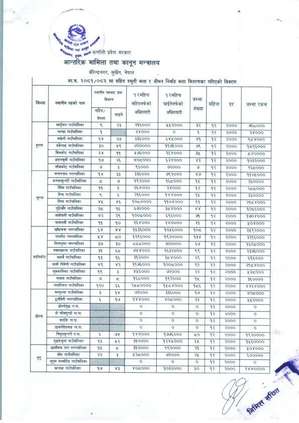 तत्कालिन सशस्त्र युद्धमा घाईते, शहिद/वेपत्ता भएका कर्णालीका २ हजार १२१ जना र घाईते भएका १ हजार ९२० जनालाई जनही दुई हजारका दरले मासिक भत्ता स्वरुप नौ करोड ६९ लाख ८४ हजार रुपैंया आर्थिक वर्ष २०८१/०८२ मा बाँडिएको हो ।