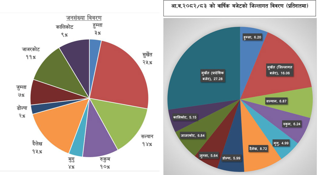 जाजरकोटमा ११ प्रतिशत जनसंख्या हुँदा ६.८४ प्रतिशत बजेट विनियोजन भएको छ भने हुम्लामा तीन प्रतिशत जनसंख्या हुँदा ६.२० प्रतिशत बजेट विनियोजन भएको हो ।