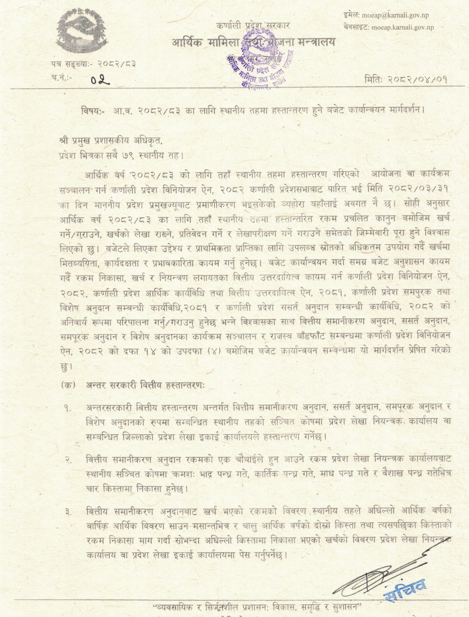 ‘यस मन्त्रालयबाट स्थानीय तहमा वित्तीय हस्तान्तरणबाट सञ्चालन हुने आयोजना वा कार्यक्रमको वित्तीय तथा भौतिक प्रगति विवरण माग गर्न सक्नेछ । यसरी माग गरिएको विवरण पेस नगर्ने स्थानीय तहलाई उपलब्ध गराइने जुनसुकै अनुदान रकम रोक्का गर्न सक्नेछ ।’ परिपत्रमा भनिएको छ, ‘ प्रदेश सरकारबाट तहाँ स्थानीय तहको लागि हस्तान्तरण गरिएको सशर्त, समपुरक र विशेष अनुदानको रकम अन्यत्र खर्च नगरी जुन आयोजना वा कार्यक्रमको लागि हस्तान्तरण भएको हो सोही आयोजना वा कार्यक्रममा खर्च गर्नु पर्नेछ ।’
