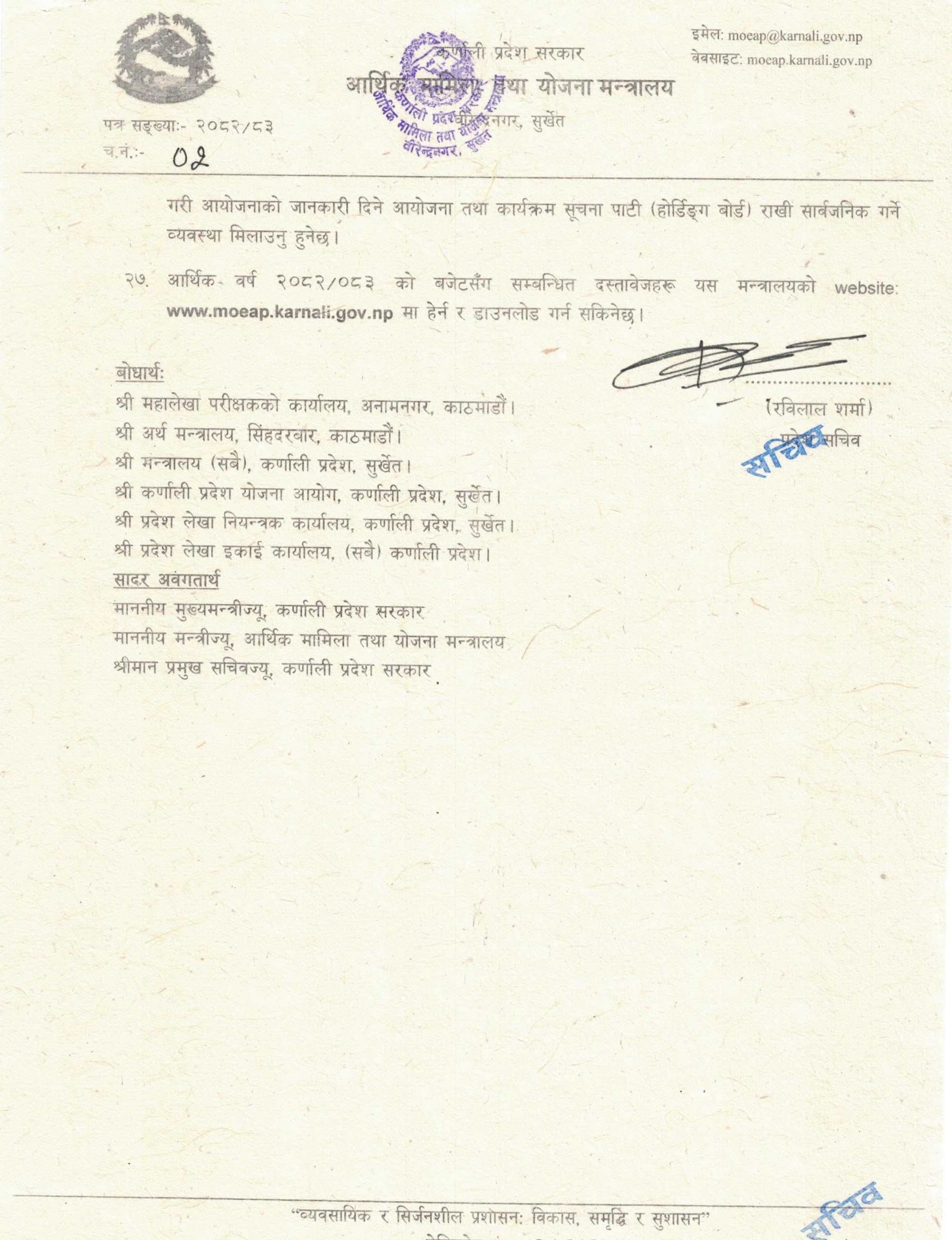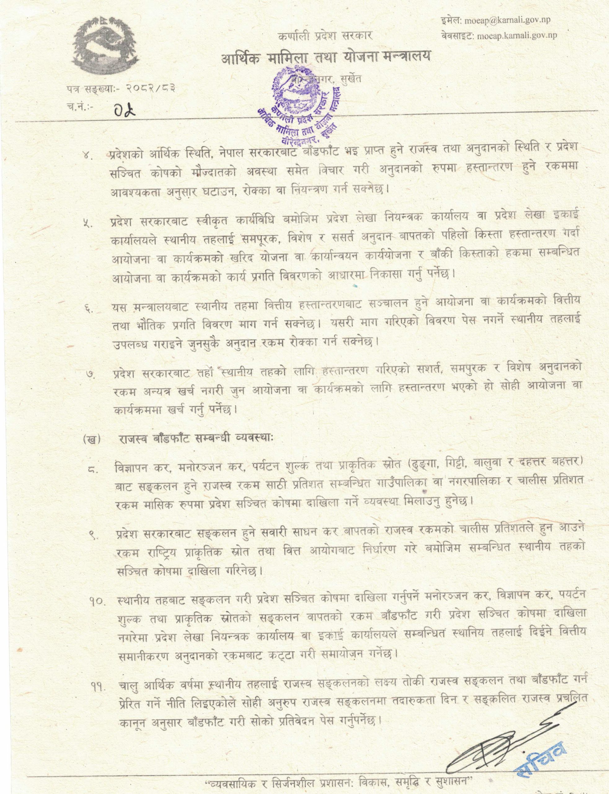 शेरबहादुर थापा/सुर्खेत । संघीयता आइसकेपछि बनेको कर्णाली प्रदेश सरकारले पहिलोपटक प्रदेश सरकारलाई बुझाउनुपर्ने कर अनिवार्य रुपमा बुझाउन बजेट कार्यान्वयन मार्गदर्शन अन्तर्गत निर्देशन दिएको छ ।