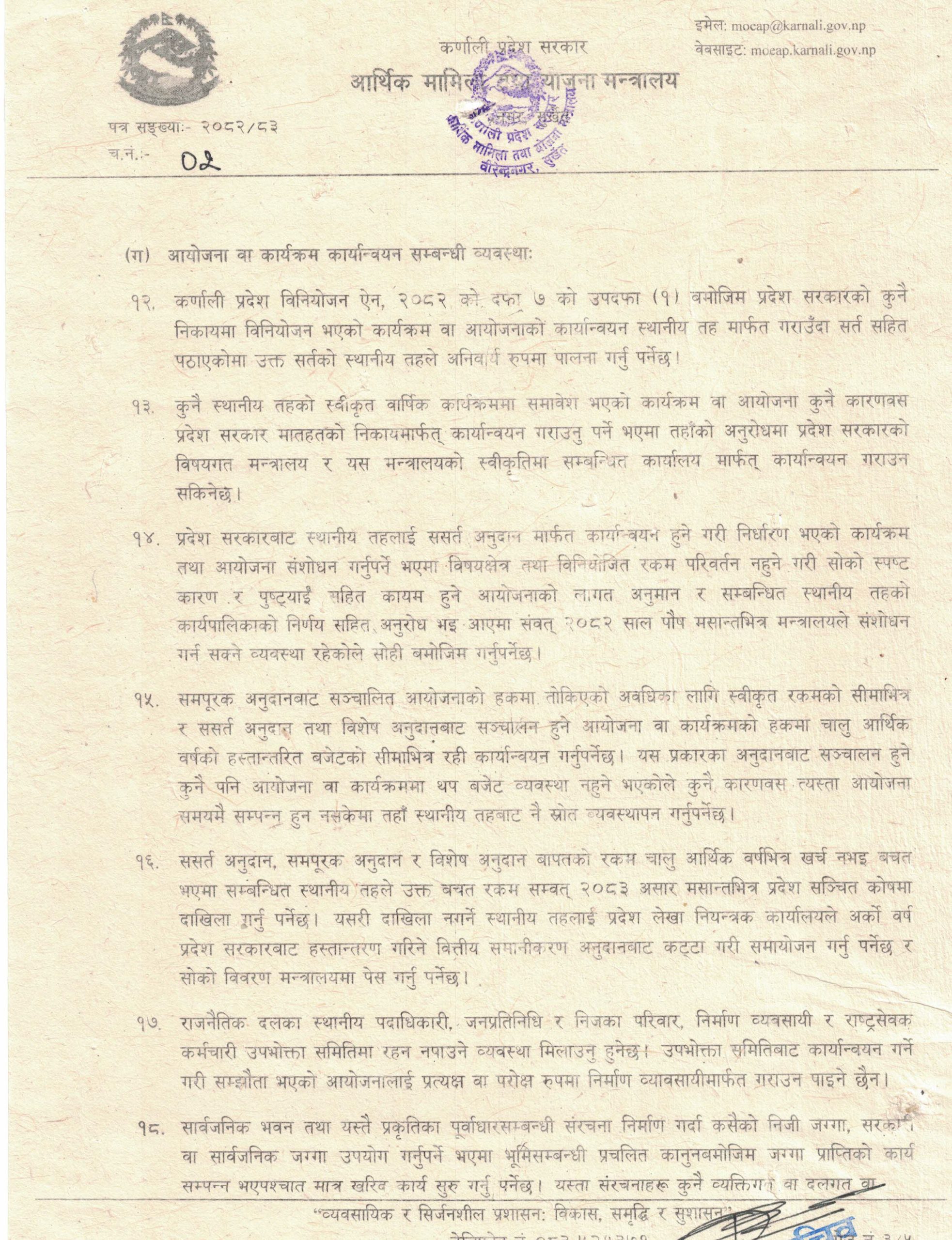 प्रदेश सरकारबाट स्थानीय तहलाई ससर्त अनुदान मार्फत कार्यान्वयन हुने गरी निर्धारण भएको कार्यक्रम तथा आयोजना संशोधन गर्नुपर्ने भएमा विषयक्षेत्र तथा विनियोजित रकम परिवर्तन नहुने गरी सोको स्पष्ट कारण र पुष्ट्याई यहित कायम हुने आयोजनाको लागत अनुमान र सम्बन्धित स्थानीय तहको कार्यपालिकाको निर्णय सहित अनुरोध भई आएमा संवत् २०८२ साल पौष मसान्तभित्र मन्त्रालयले संशोधन गर्न सक्ने व्यवस्था रहेकोले सोही बमोजिम गर्नुपर्ने उल्लेख छ ।