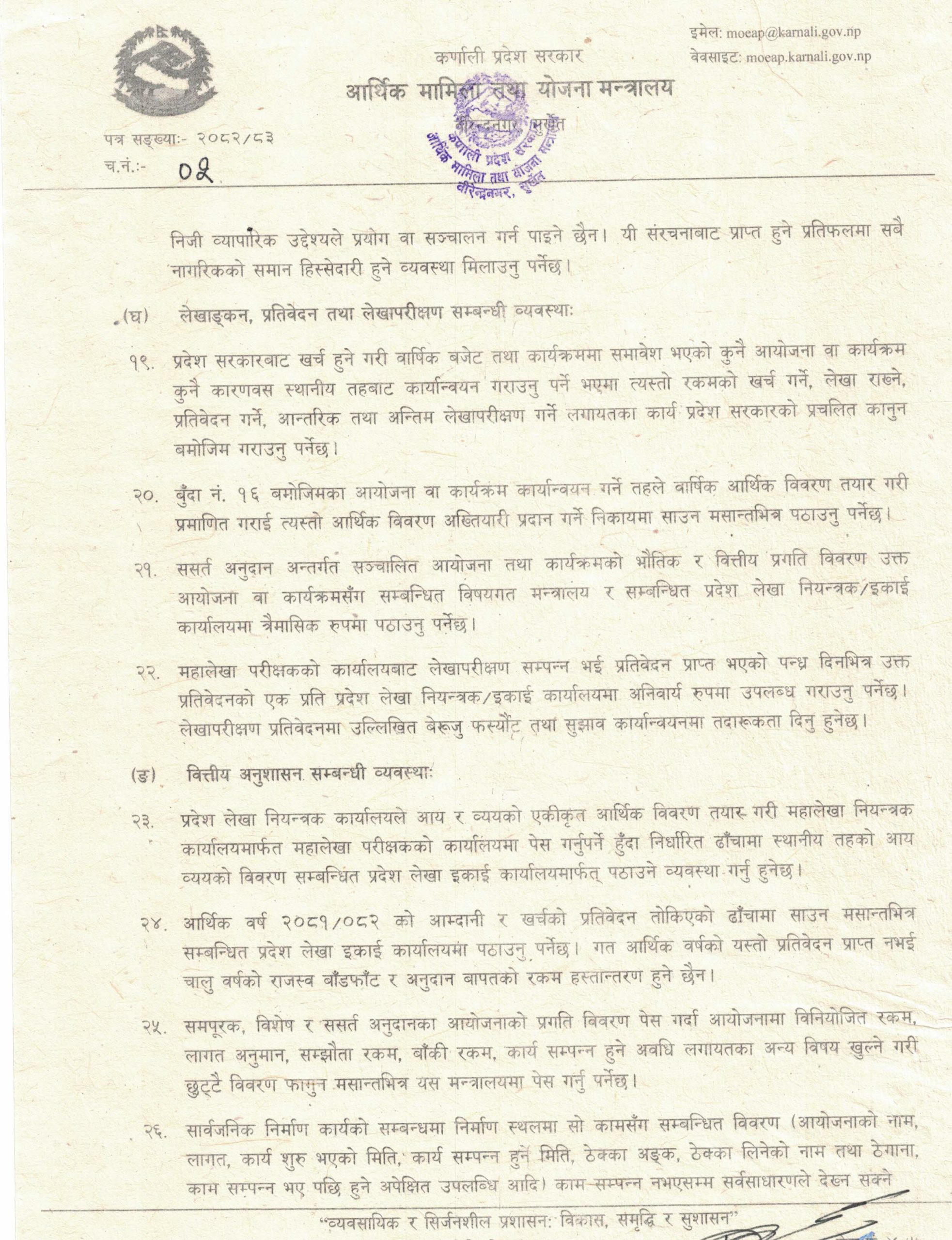आर्थिक मितव्ययिता, अनुशासनमा रहनुपर्ने बताउँदै आएका कर्णाली प्रदेश सरकारका मुख्यमन्त्री यामलाल कंडेलले प्रदेशमा आर्थिक सुशासन कायम गर्न नीतिगत रुपमा विभिन्न निर्णय मातहतका मन्त्रालयबाट गराउँदै आएका छन् । सोही योजना अन्र्तगत यो मार्गदर्शन आर्थिक मामिला तथा योजना मन्त्रालयले जारी गरेको हो ।