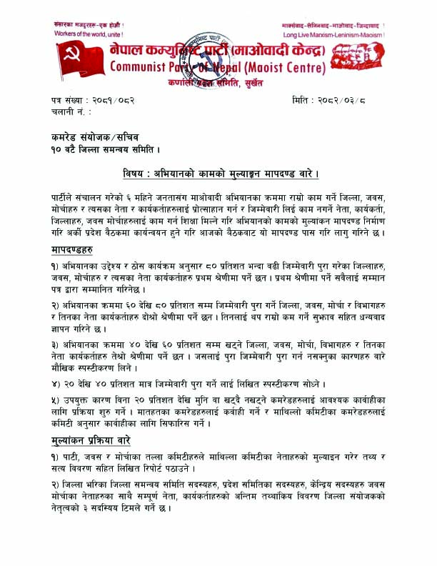 ३) अभियानका क्रममा ४० देखि ६० प्रतिशत सम्म खट्ने जिल्ला, जवस, मोची, विभागहरु र तिनका नेता कार्यकताहरु तेश्रो श्रेणीमा पर्ने छन । जसलाई पुरा जिम्मेवारी पुरा गर्न नसक्नुका कारणहरु वारे मौखिक स्पस्टीकरण लिने ।