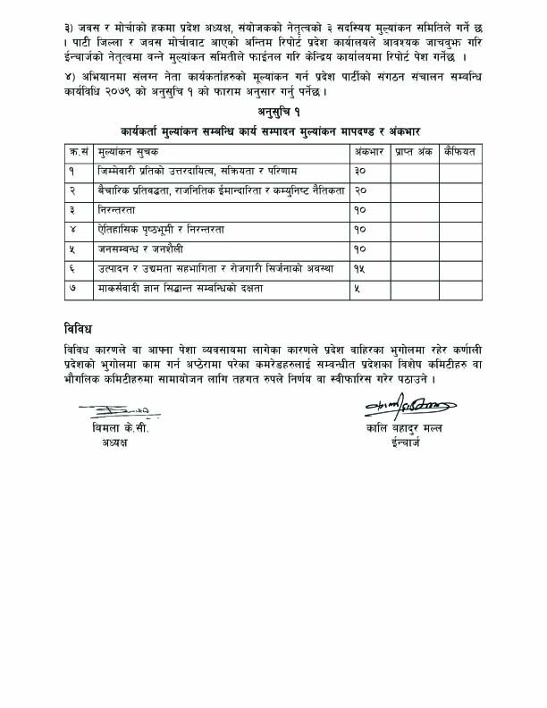 यस्तै, वैठकले पार्टीले सञ्चालन गरेको छ महिने अभियानमा पार्टी कार्यकर्ताको खटन पटनको मूल्यांकन गर्ने भएको अध्यक्ष केसिले जानकारी दिईन ।