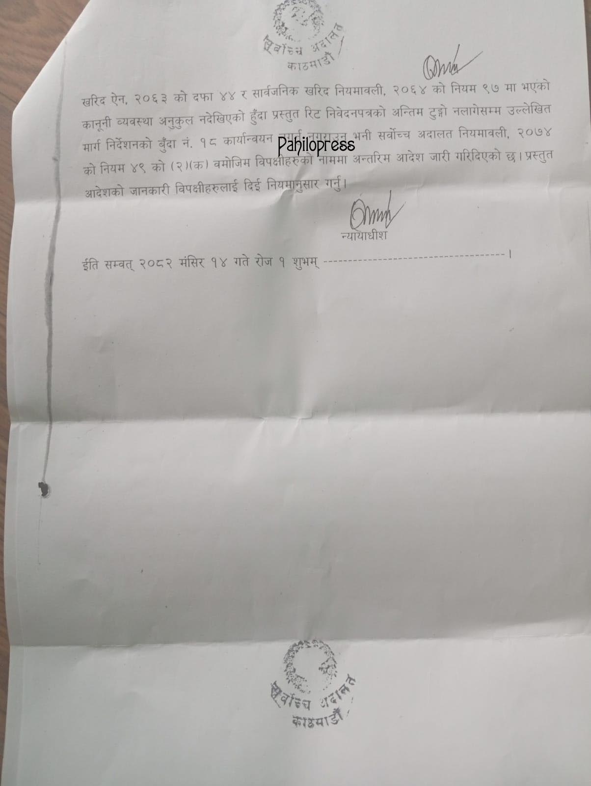 ‘अन्तरिम आदेश माग भएको सन्दर्भमा विचार गर्दा, कर्णाली प्रदेश सरकार आर्थिक मामिला तथा योजना मन्त्रालयले मिति २०८२÷४÷१ मा आ.ब. २०८२÷०८३ को बजेट तथा कार्यक्रम कार्यान्वयन मार्गदर्शनको बुँदा नं. १८ मा उल्लेखित प्रदेश सरकारको निती अनुरुप रु.३०,००,०००÷–(तीस लाखो भन्दा बढी रकम विनियोजन भएका आयोजना उपभोक्ता समिति मार्फत कार्यन्वयन नगरी खुल्ला बोलपत्रको प्रकृया मार्फत खरिद गर्नु पर्नेछ“ भन्ने व्यवस्था प्रथम दृष्टिमा नै सार्वजनिक खरिद ऐन, २०६३ को दफा ४४ र सार्वजनिक खरिद नियमावली, २०६४ को नियम ९७ मा भएको कानूनी व्यवस्था अनुकुल नदेखिएको हुँदा प्रस्तुत रिट निवेदनपत्रको अन्तिम टुङ्गो नलागेसम्म उल्लेखित मार्ग निर्देशनको बुँदा नं. १८ कार्यान्वयन नगर्नु नगराउनु भनी सर्वोच्च अदालत नियमावली, २०७४ को नियम ४९ को (२(क) बमोजिम विपक्षीहरुको नाममा अन्तरिम आदेश जारी गरिदिएको छ । प्रस्तुत आदेशको जानकारी विपक्षीहरुलाई दिई नियमानुसार गर्नु ।’ आदेशमा उल्लेख छ ।